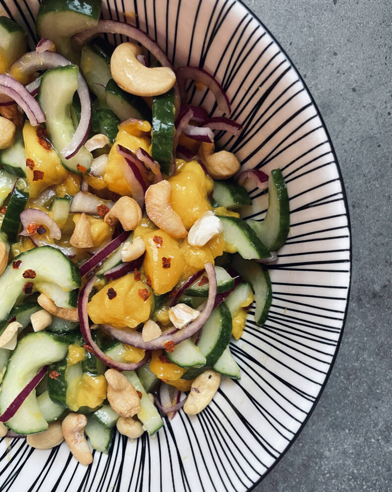 - Doe de komkommer, mango en ui in de kom met de dressing roer goed door zodat de dressing goed kan intrekken.