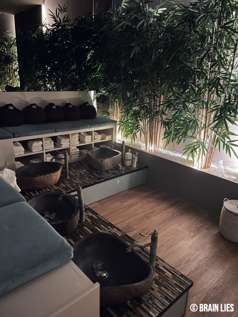 In deze mega mooie ruimte, mag je plaatsnemen op een bank met allemaal kussentjes, voetenbadjes op de grond met mooie kranen en stenen in de badjes. Hierin zit heerlijk warm water en pure magnesium kristallen. We kregen ook een kopje thee en een schaaltje met fruit. Wat een heerlijk begin. Je komt gelijk tot rust. Rick zei tegen me: ' Nou Lies, dit is helemaal een plekje voor jou, zo rustig en zo weinig prikkels'. En dat was het ook. Ik kreeg steeds meer rust en zin in de rest van de behandeling.
